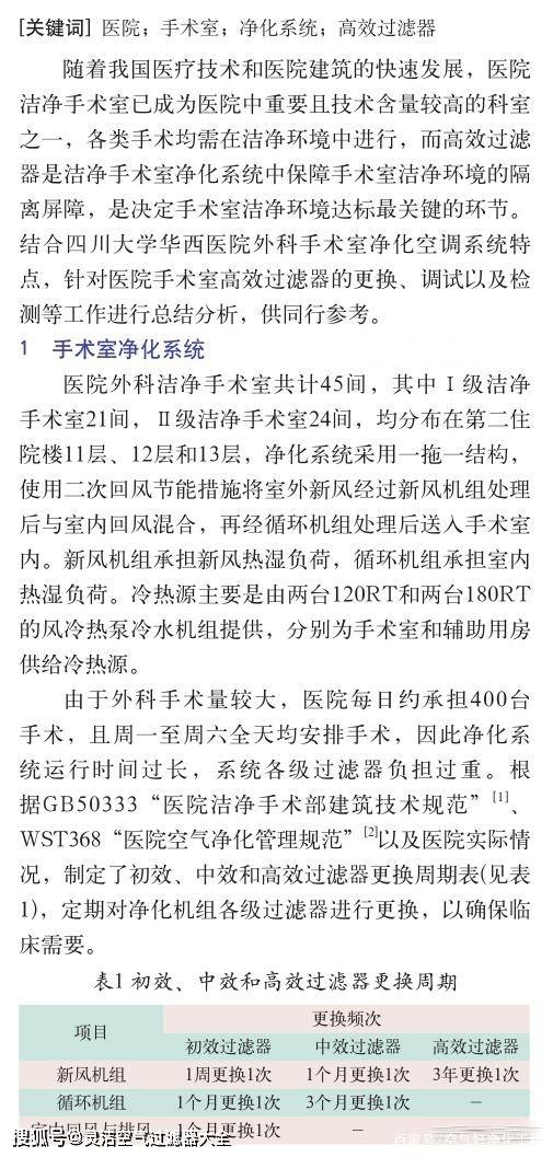 隨著我國醫(yī)療技術和醫(yī)院建筑的快速發(fā)展,醫(yī)院潔凈手術室已成為醫(yī)院中重要且技術含量較高的科室之一,各類手術均需在潔凈環(huán)境中進行,而高效過濾器是潔凈手術室凈化系統(tǒng)中保障手術室潔凈環(huán)境的隔離屏障,是決定手術室潔凈環(huán)境達標最關鍵的環(huán)節(jié)。