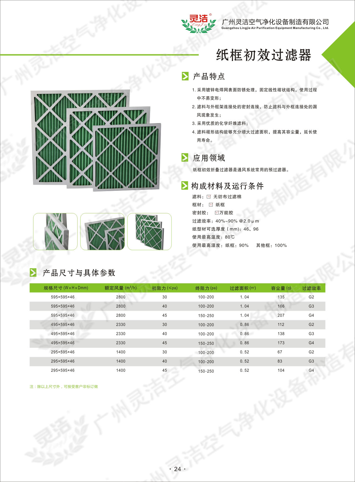 初效過濾器結(jié)構(gòu)一般分為龍骨架和框骨架。龍骨架的特點(diǎn)是結(jié)實(shí),濾材分布均勻,但制作費(fèi)時(shí)費(fèi)工。框骨架的特點(diǎn)是更換濾料方便,制作省時(shí),強(qiáng)度比龍骨架略差。外框材料有紙框、鋁框、鍍鋅鐵框,過濾材料有無紡布、尼龍網(wǎng)、活性碳濾材、金屬孔網(wǎng)等,防護(hù)網(wǎng)有雙面噴塑鐵絲網(wǎng)和雙面鍍鋅鐵絲網(wǎng)。